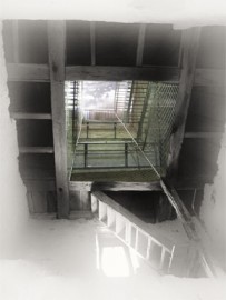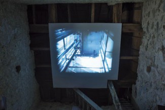 Construite sur l’effet de perspective d’une contre-plongée dans un espace restreint, cette installation vidéo suggère par son mouvement en aller et retour un déplacement vertical dans les hauteurs du clocher. Elle illustre la sensation paradoxale – mélange d’enfermement et d’ouverture – que j’ai ressentie en pénétrant pour la première fois dans l’intérieur aux proportions si particulières du Turlet.