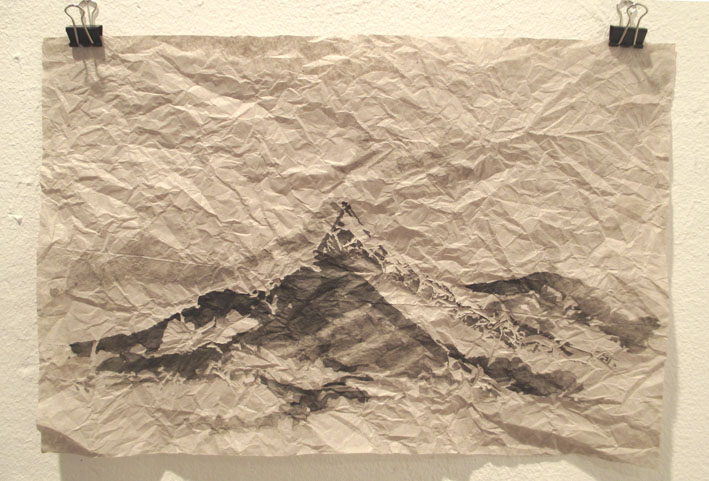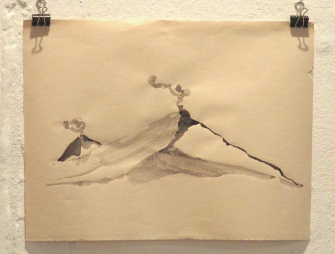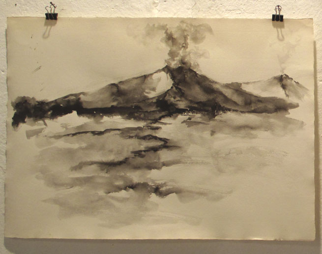 En regard du mur de photos accompagnant l’installation Digitales en version diaporama, j’ai présenté une série d’esquisses et d’études de volcans à l’encre de chine, qui préfigure un nouveau travail de dessin en grand format.