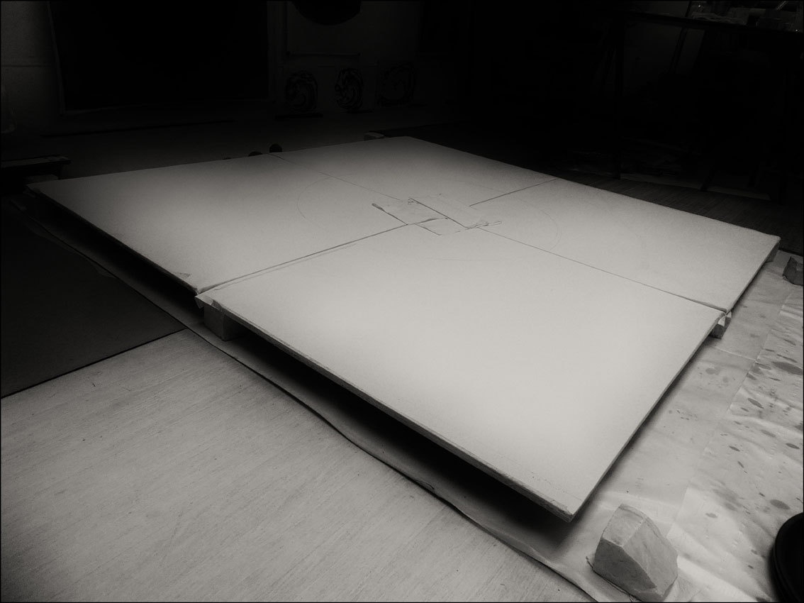 Et puis, même si cette peinture n’évoluera plus beaucoup, il faudra encore construire les châssis et y tendre les quatre feuilles avant d’être certaine de l’aspect final de l’ensemble.