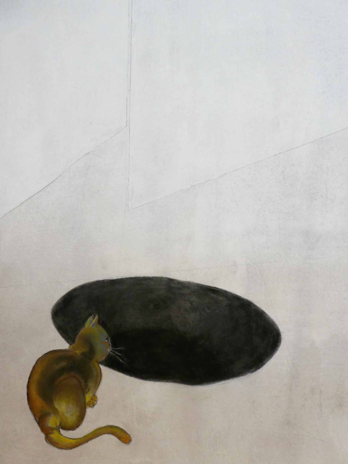 De retour à l’atelier, j’ai dessiné un chat au pastel et fusain sur le carton de chantier que j’avais entrepris de tester. J’ai aussi voulu rectifier la courbe de mon disque en perspective pour que le trou au sol apparaisse plus clairement.