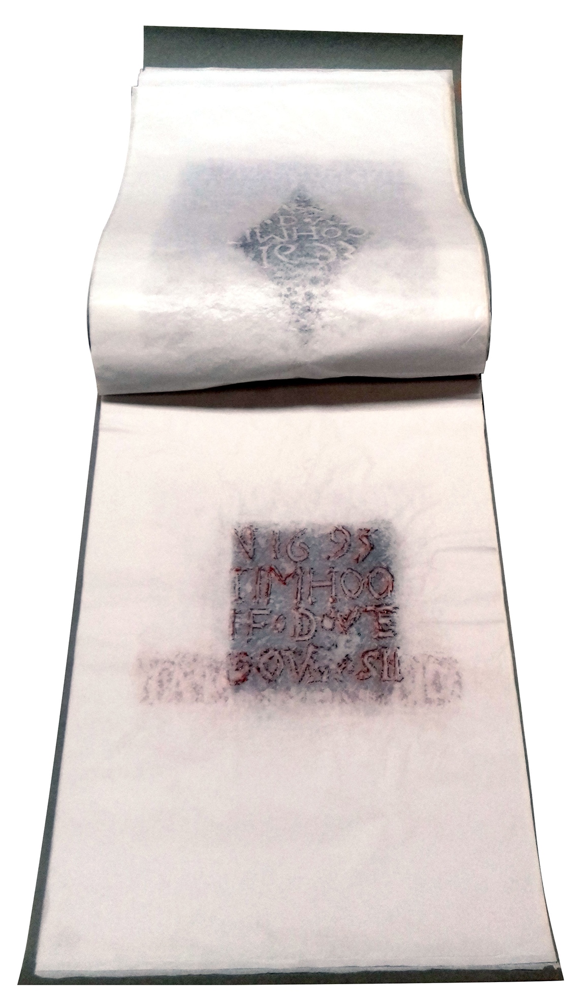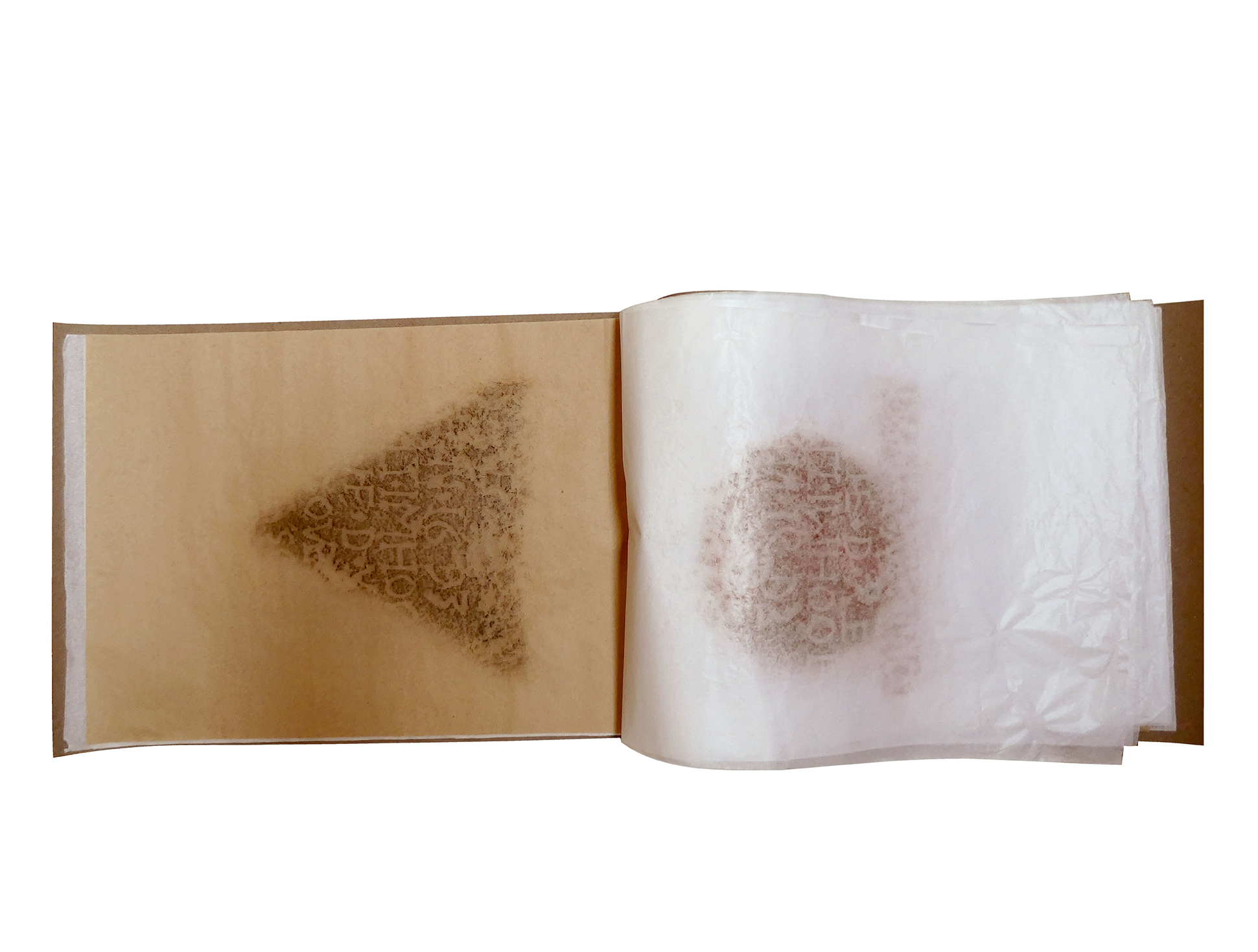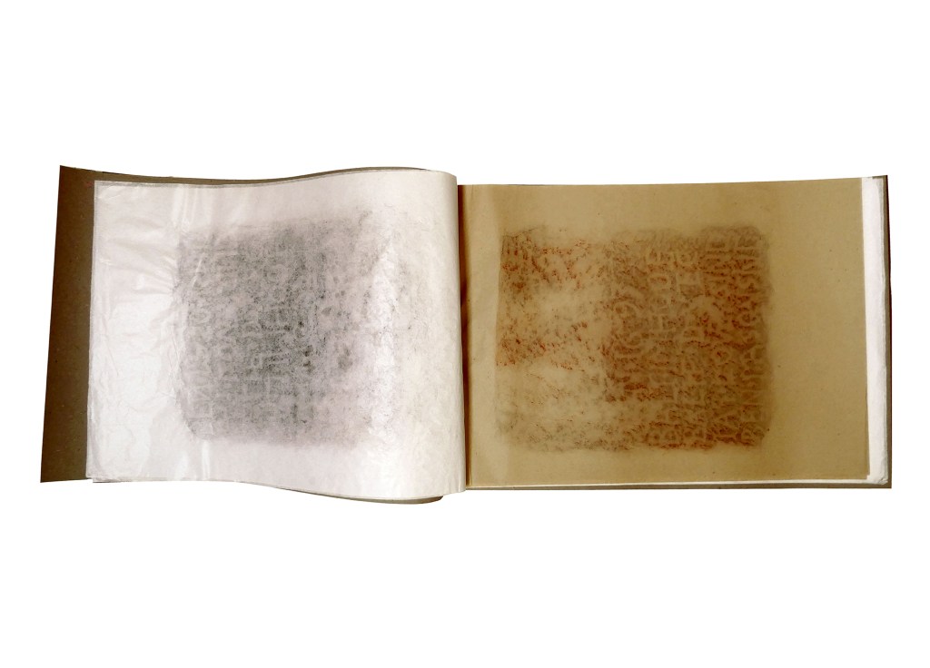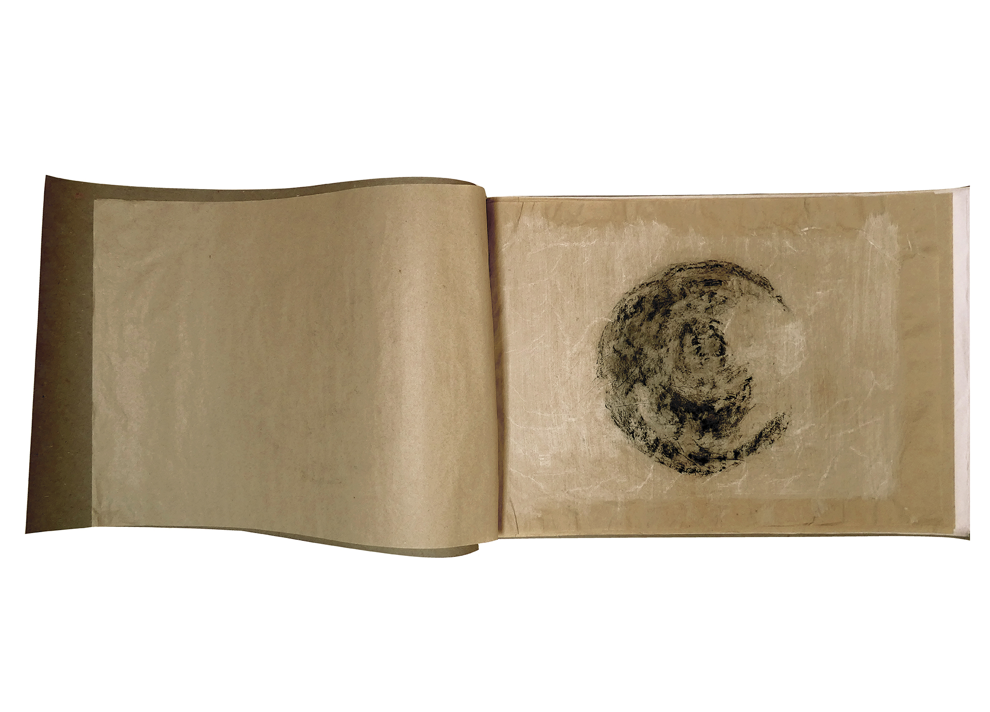 Pour créer mon livre-objet, j’ai réalisé dans un format de 50 par 70 cm, quelques vingt-cinq empreintes que j’ai ensuite reliées en atelier.
