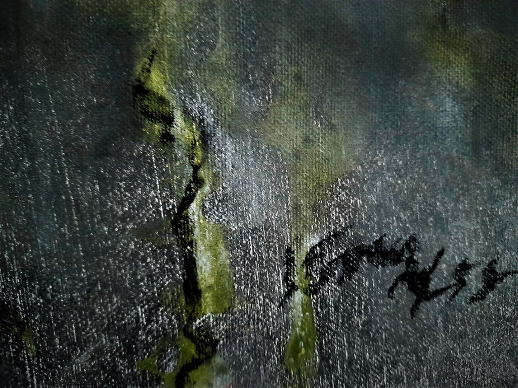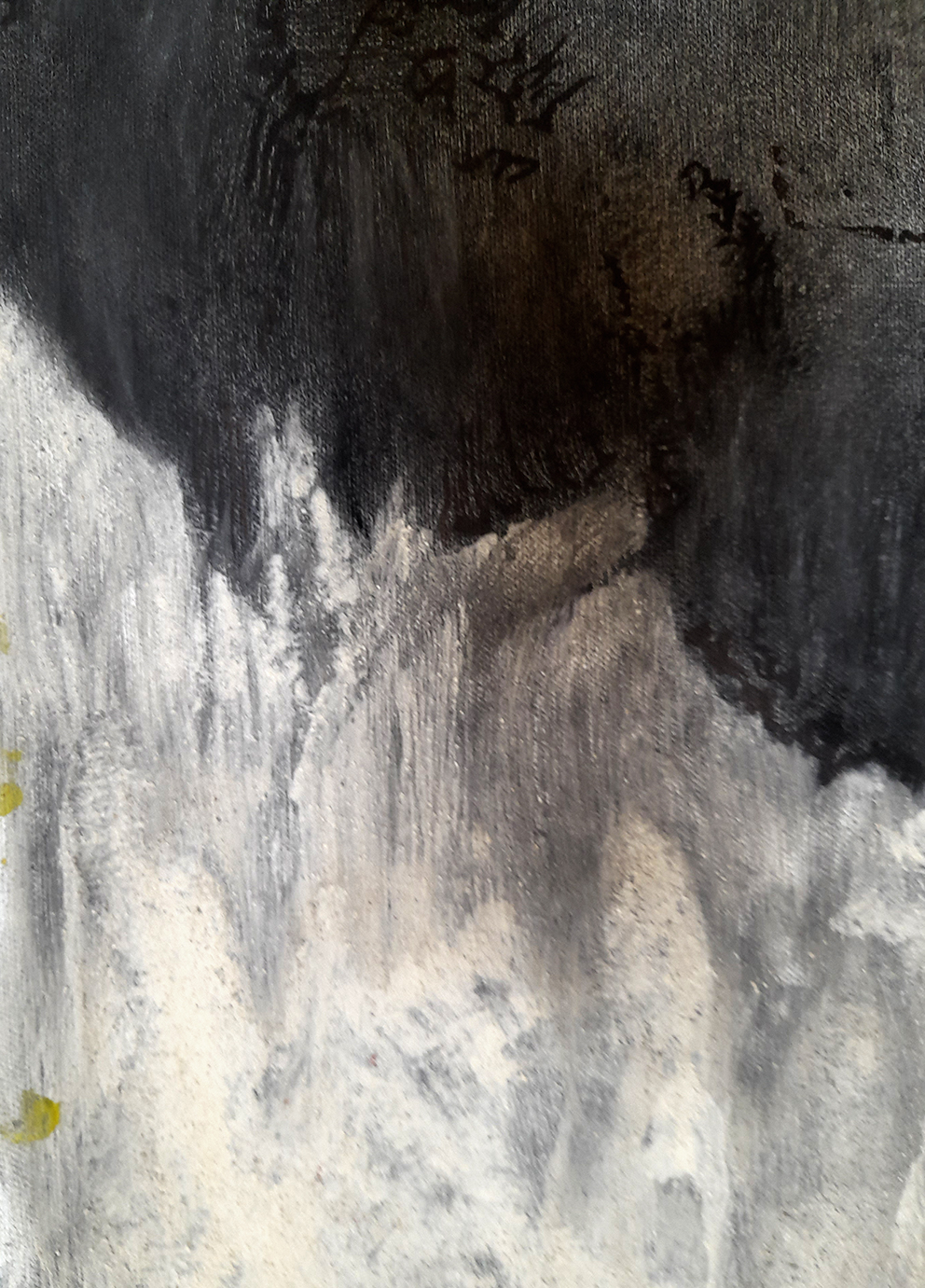 Par la suite j’ai repris le mélange qui me satisfaisait le plus, et l’ai appliqué cette fois sur un fond peint au noir de charbon. Ici j’ai créé comme des veines à l’encre pure, puis j’ai tenté la couleur. Il m’a fallu longtemps pour trouver acceptable cette ligne de couleurs aux pigments rehaussés de pastel et de fusain ! Longtemps je m’en suis voulue d’avoir saboté cette seconde « pièce d’essai » avec cette ligne incongrue surgie de dieu sait où dans ma peinture…
