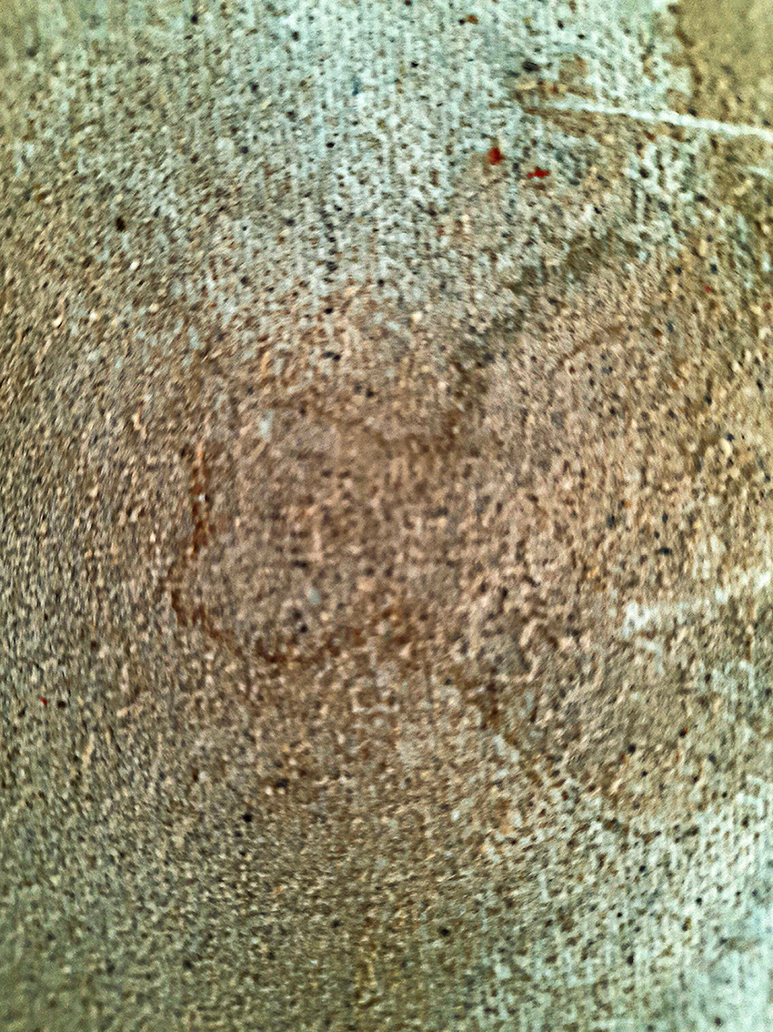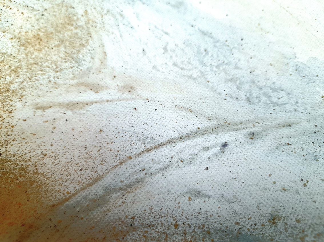 Pour commencer, je l’ai saupoudrée sur une base fraiche et collante, puis j’ai travaillé au couteau une masse préparée comme je prépare mes couleurs aux pigments. Plus ou moins compacte, plus ou moins diluée, j’ai testé le pouvoir d’attachement sur la toile de cette nouvelle matière, cette »couleur en devenir ».