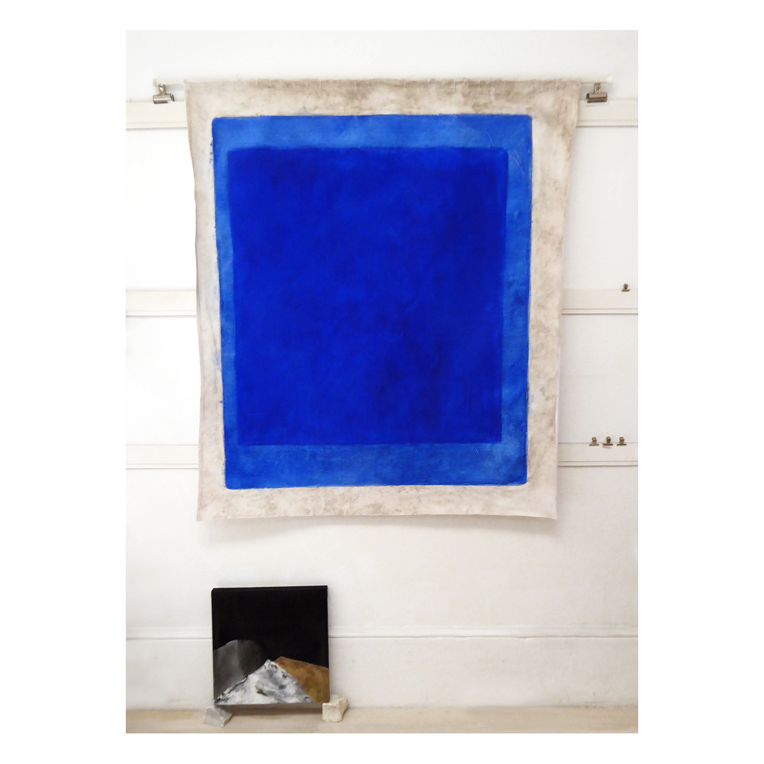 J’ai ré enduit mon morceau de drap en y mêlant du café sur les parties extérieures, puis j’ai préparé une pâte bleue selon ma petite cuisine habituelle. La couleur non diluée est posée sur la partie centrale de cette nouvelle pièce, alors qu’elle est diluée sur son bord. Pour l’extérieur, j’ai simplement ajouté un l’enduit « caféiné » que j’ai modulé jusqu’à obtenir un blanc cassé qui tire légèrement sur le rosé.