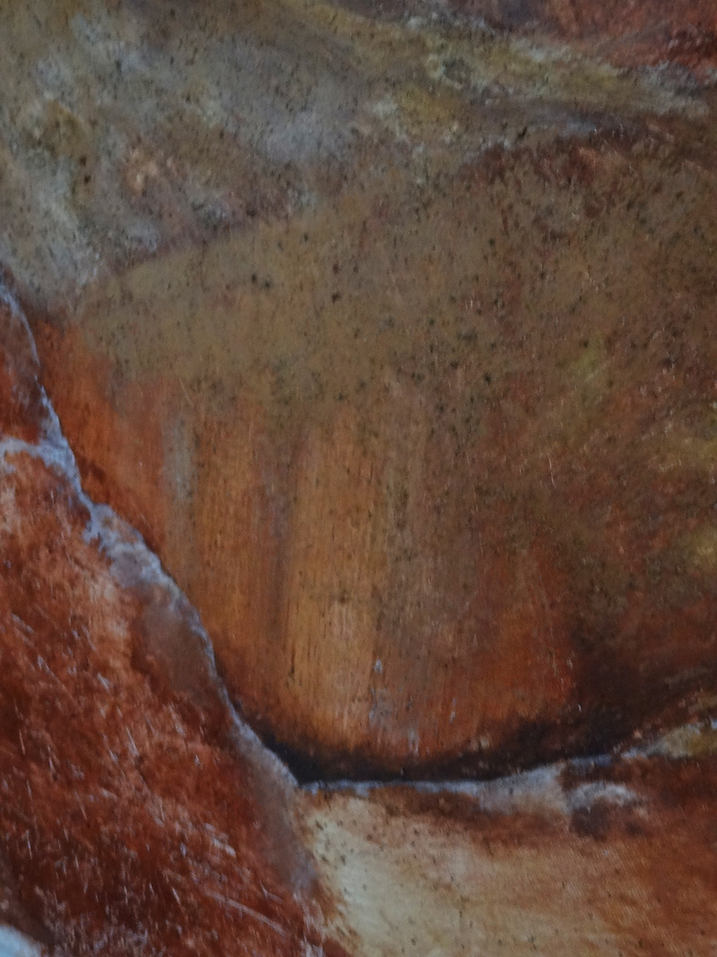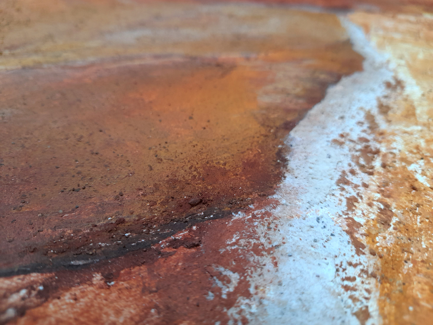 Pierre rouge est une peinture de poudres de pierres et de terres mélangées, auxquelles j’ai parfois ajouté une touche de pigments pour obtenir les teintes recherchées.