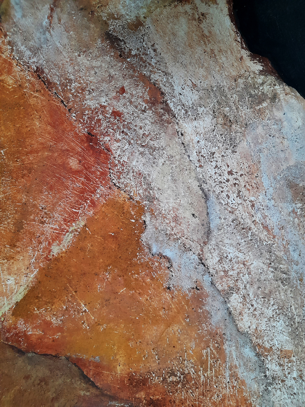 Pierre rouge est une peinture de poudres de pierres et de terres mélangées, auxquelles j’ai parfois ajouté une touche de pigments pour obtenir les teintes recherchées.
