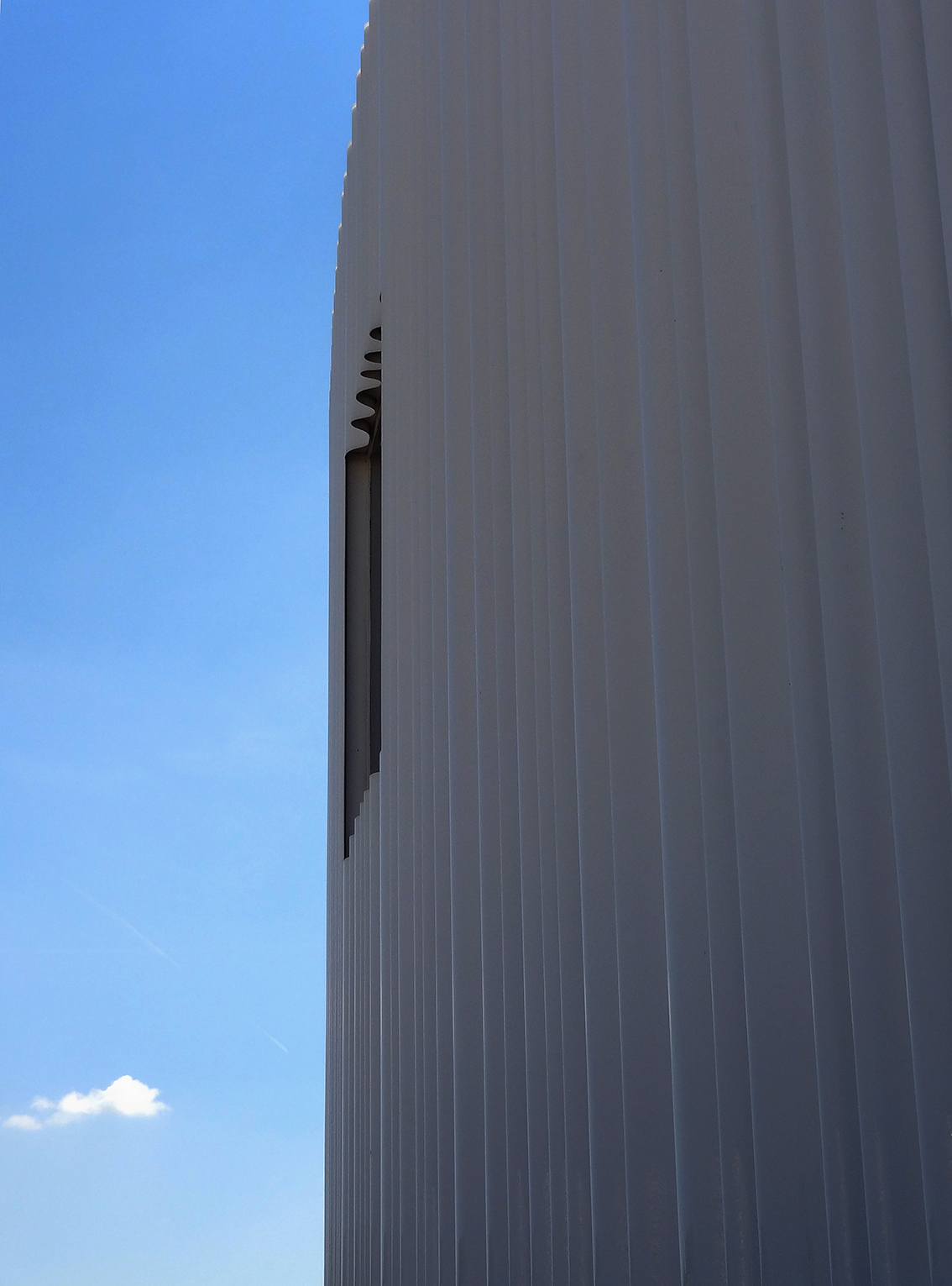 C’est le duo d’architectes japonais du cabinet Sanaa qui a réalisé cette gigantesque halle « circulaire-mais-pas-tout-à-fait »recouverte d’une tôle ondulée aux plis irréguliers.