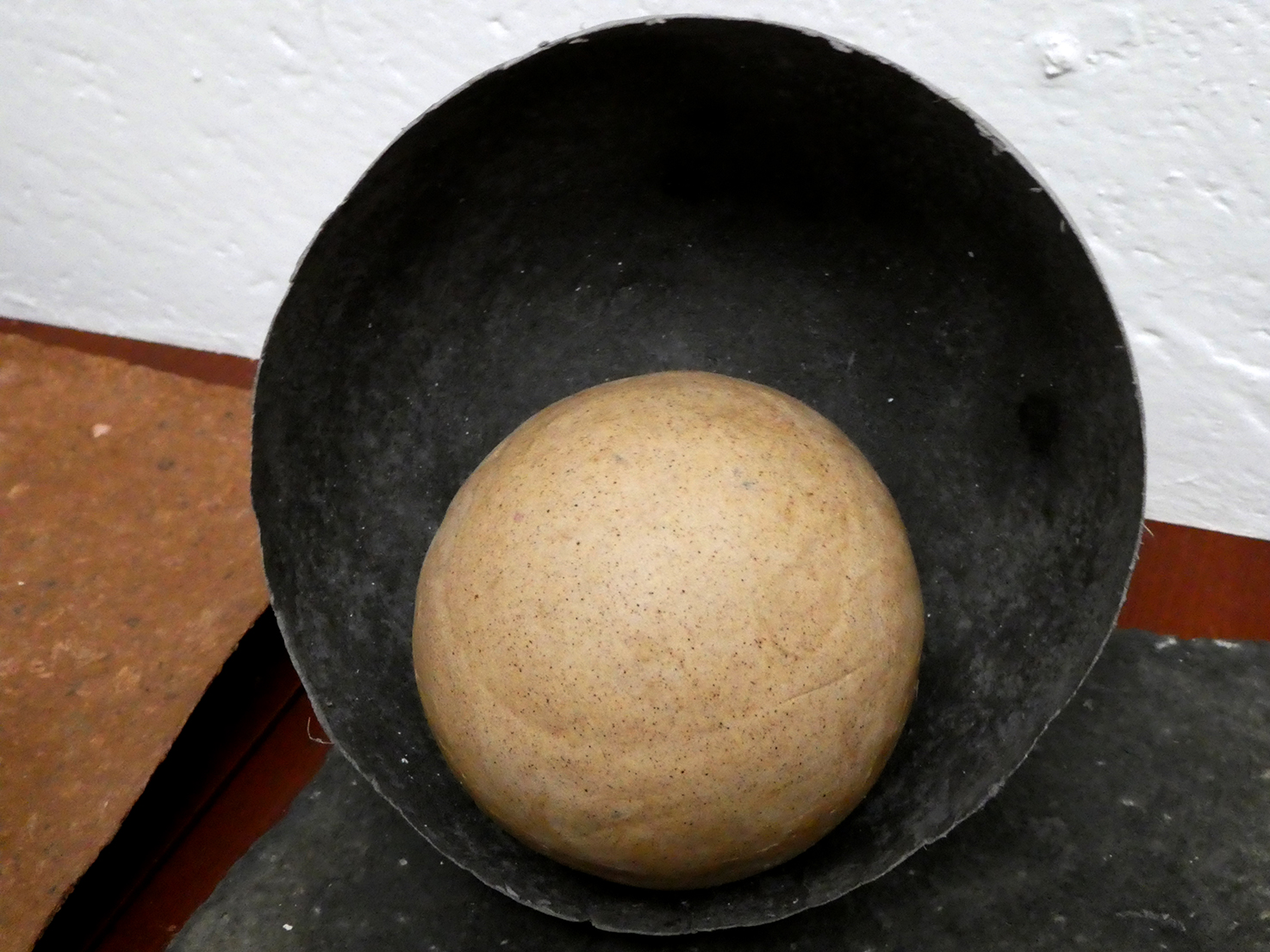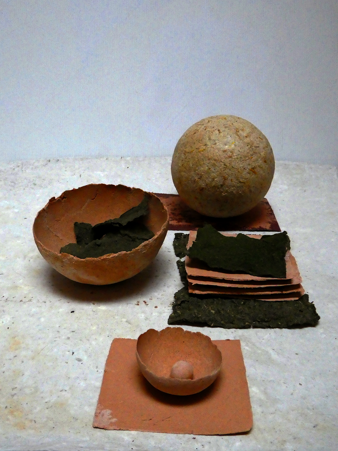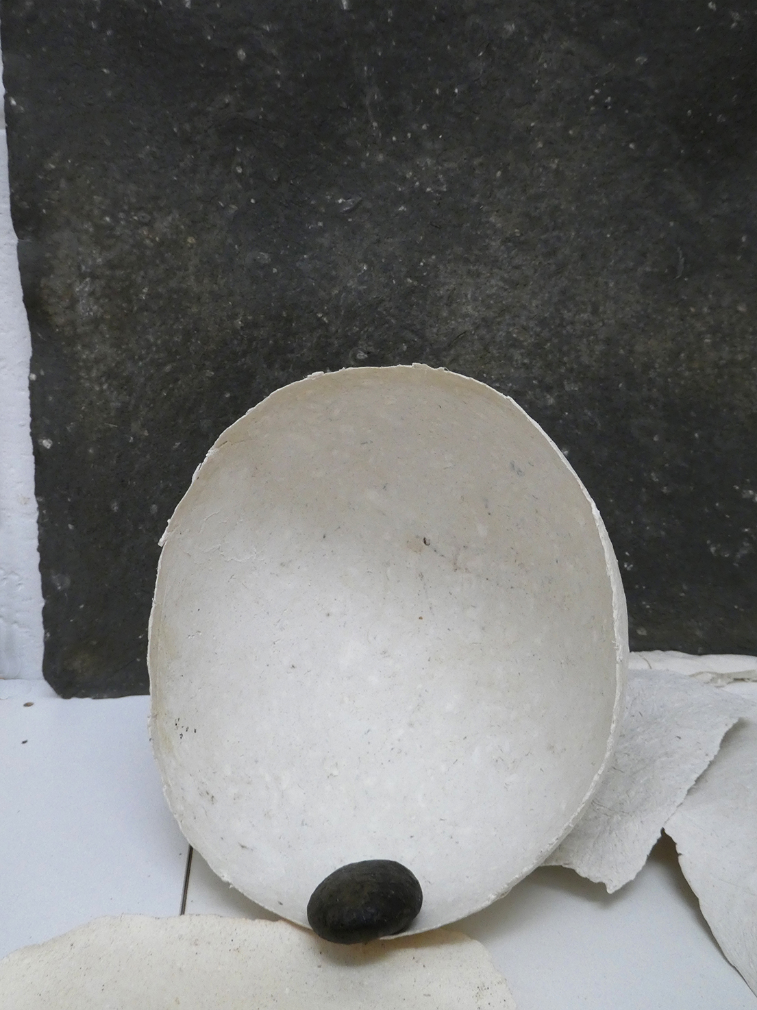 Une boule et un bol de carton-pierre posés sur une feuille de pulpe de papier.