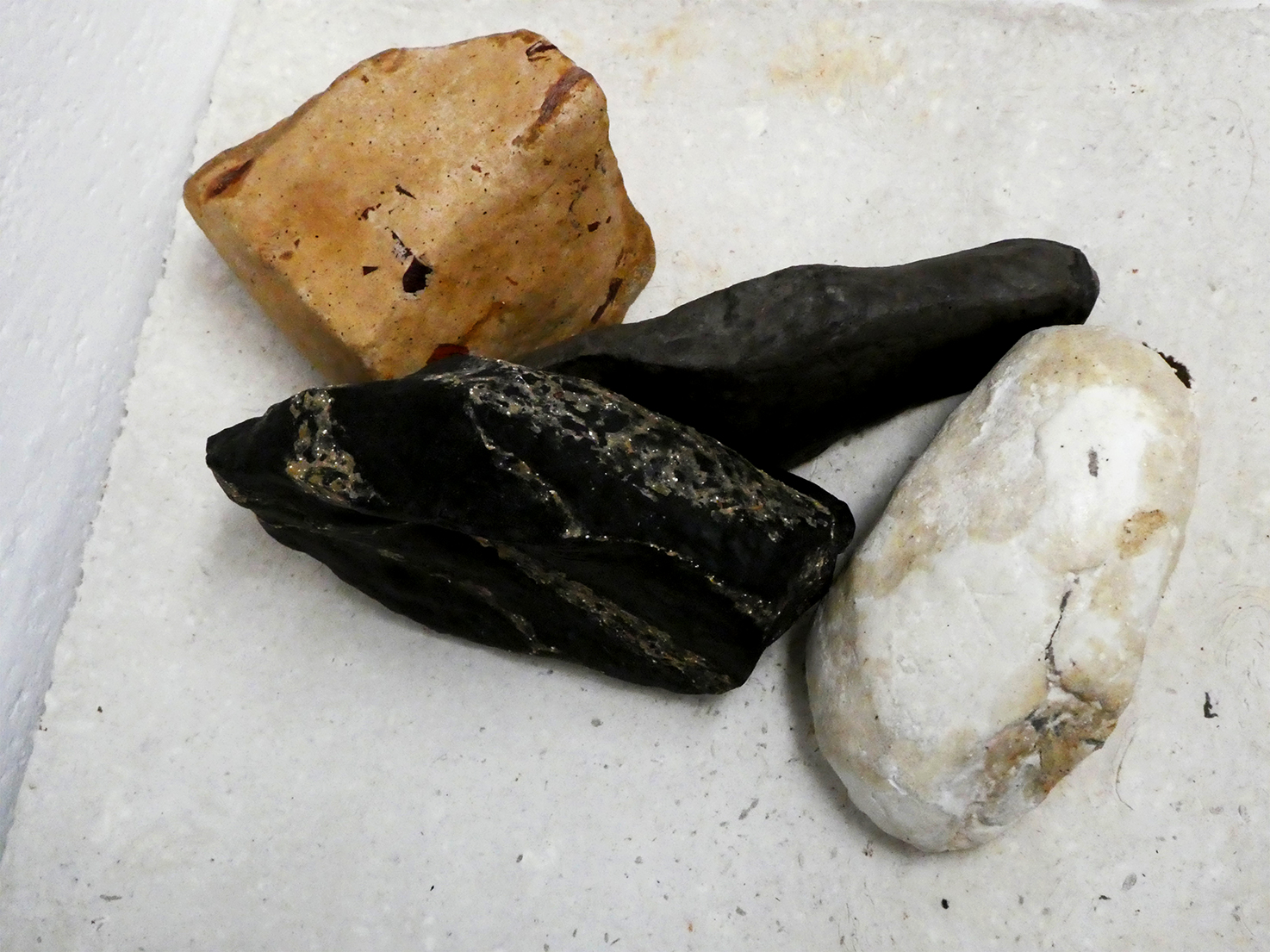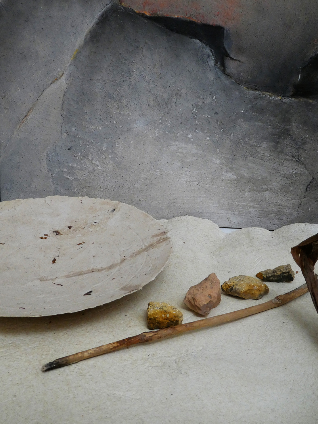 quelques pierres en carton-pierre, un fuseau en carton et poudre d’ocre,