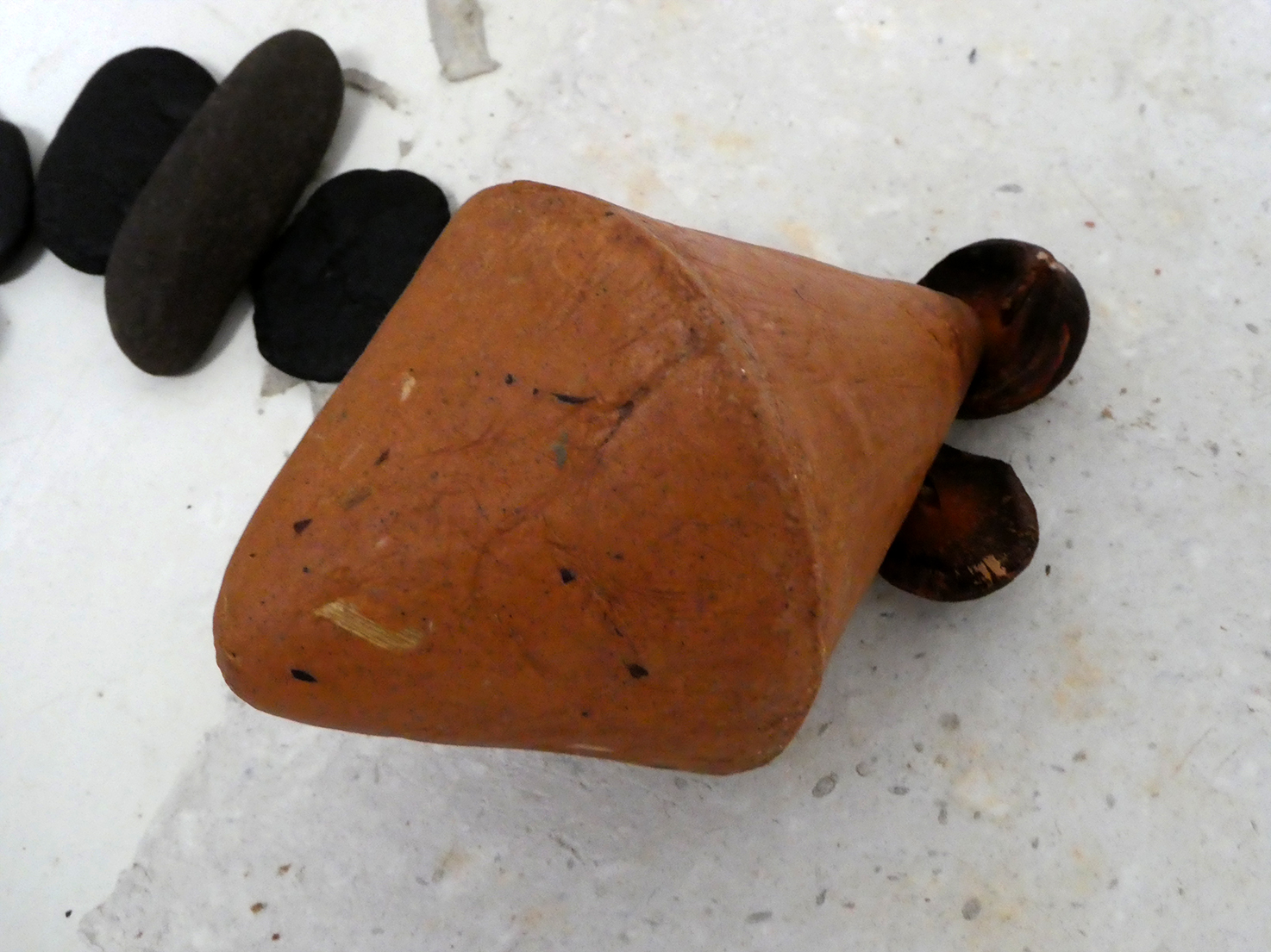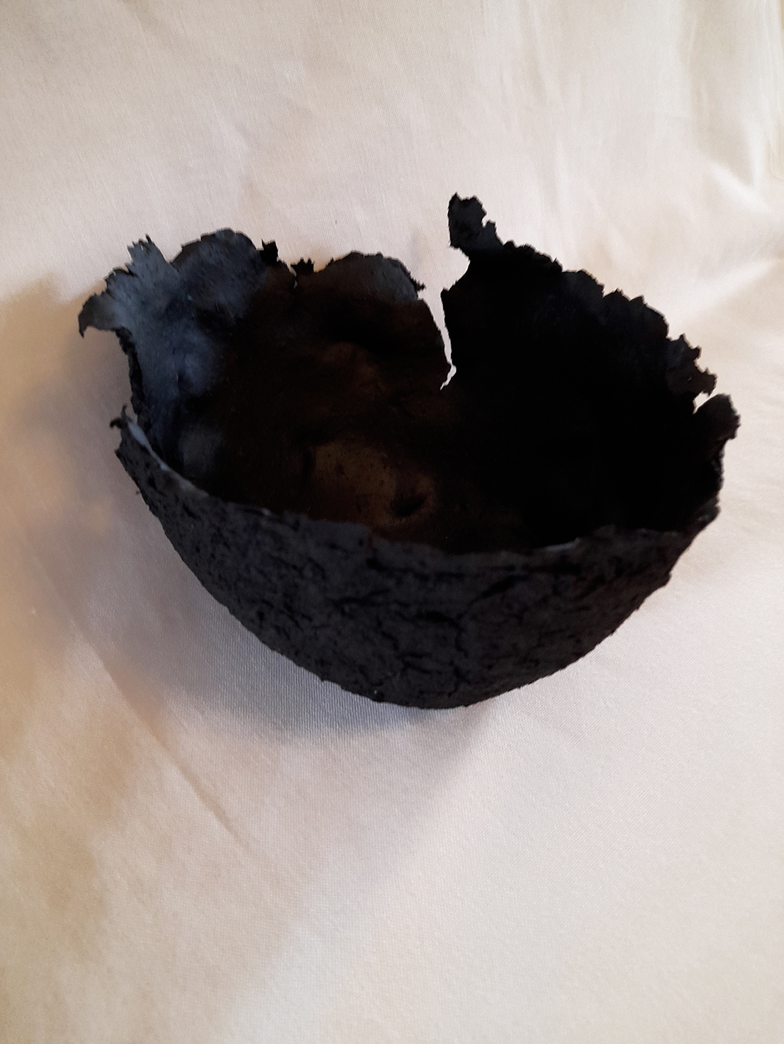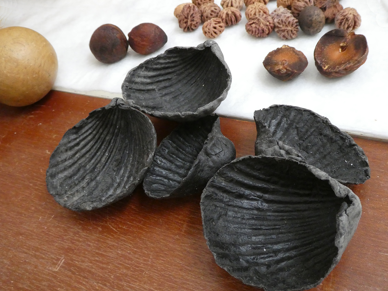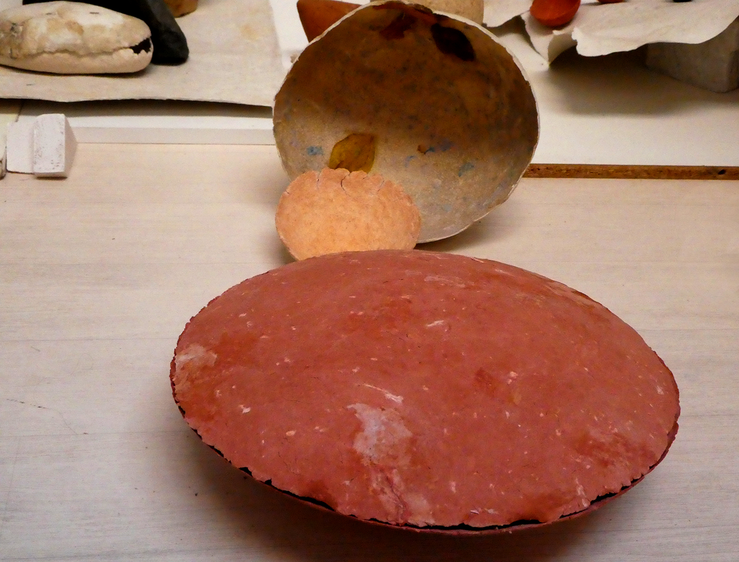 Comme je voulais éviter les « artifices » tels que mastic synthétique, colle vinylique ou ciment prompt pour solidifier mes volumes, j’ai ajouté de la poudre de pierre et de la colle de farine à la pulpe de papier. Puis il a fallu chercher un moyen d’imperméabiliser un minimum mes petits objets. La recherche d’une cire naturelle applicable sans drames m’a pris quelque temps. J’ai finalement adopté un encaustique maison qui m’a donné des résultats encourageants. Puis j’ai ajouté à mon mélange de base une colle de sel, ce qui renforce la solidité, certes, mais s’avère très sensible aux variations de temps et de pression.