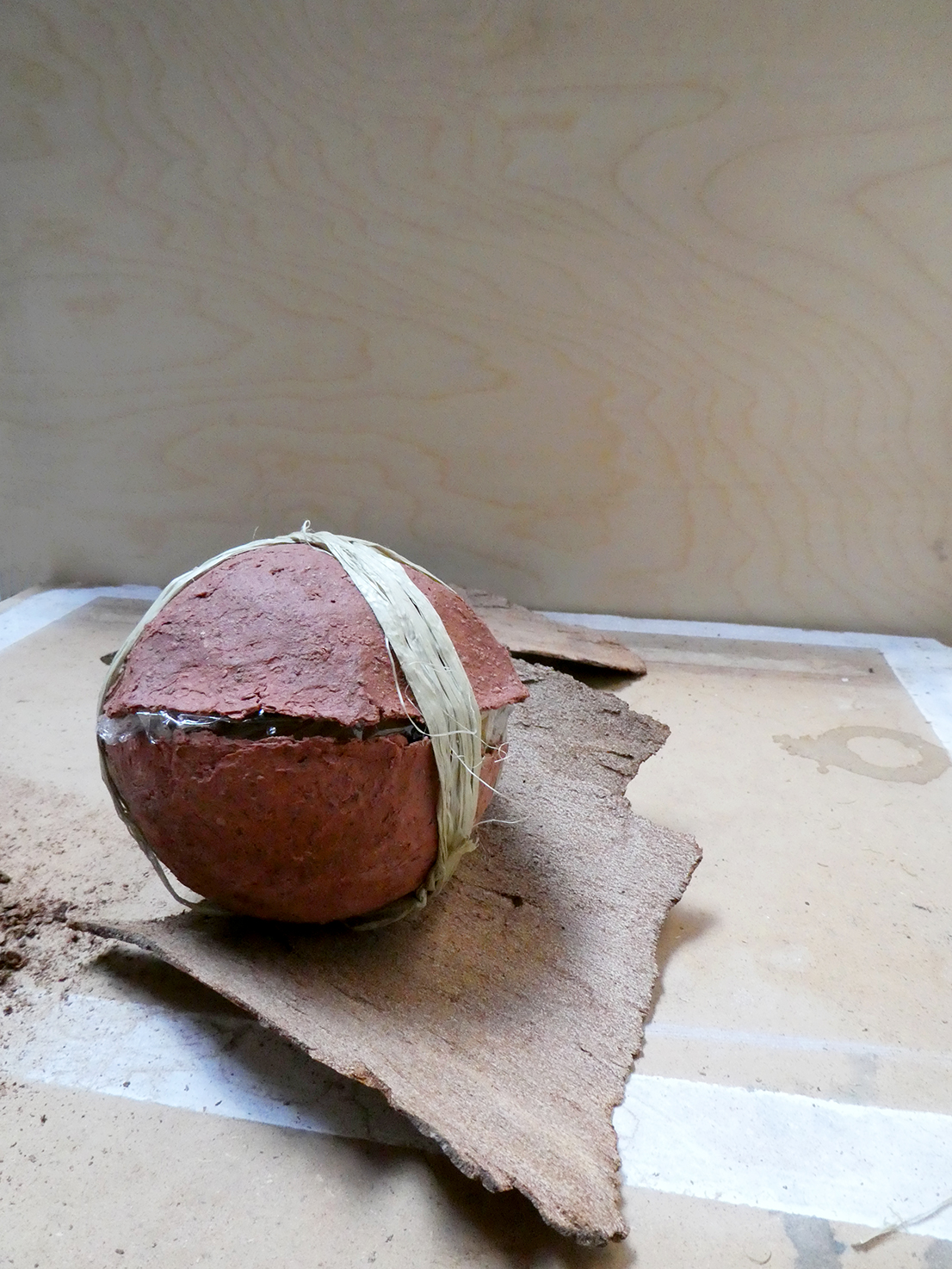 J’étais attirée depuis longtemps par le papier mâché. Rapidement, le travail de la pulpe de papier a pris le dessus sur celui des bandes encollées. Avec l’ajout de colles à mes mélanges, j’étais dès lors plus près de structures de carton que de papier artisanal. J’ai fait passablement de recherches et d’essais qui m’ont amenée à m’intéresser à l’ajout de végétaux. Dans mes « papiers » d’abord, puis comme matériaux de base de mes mélanges.