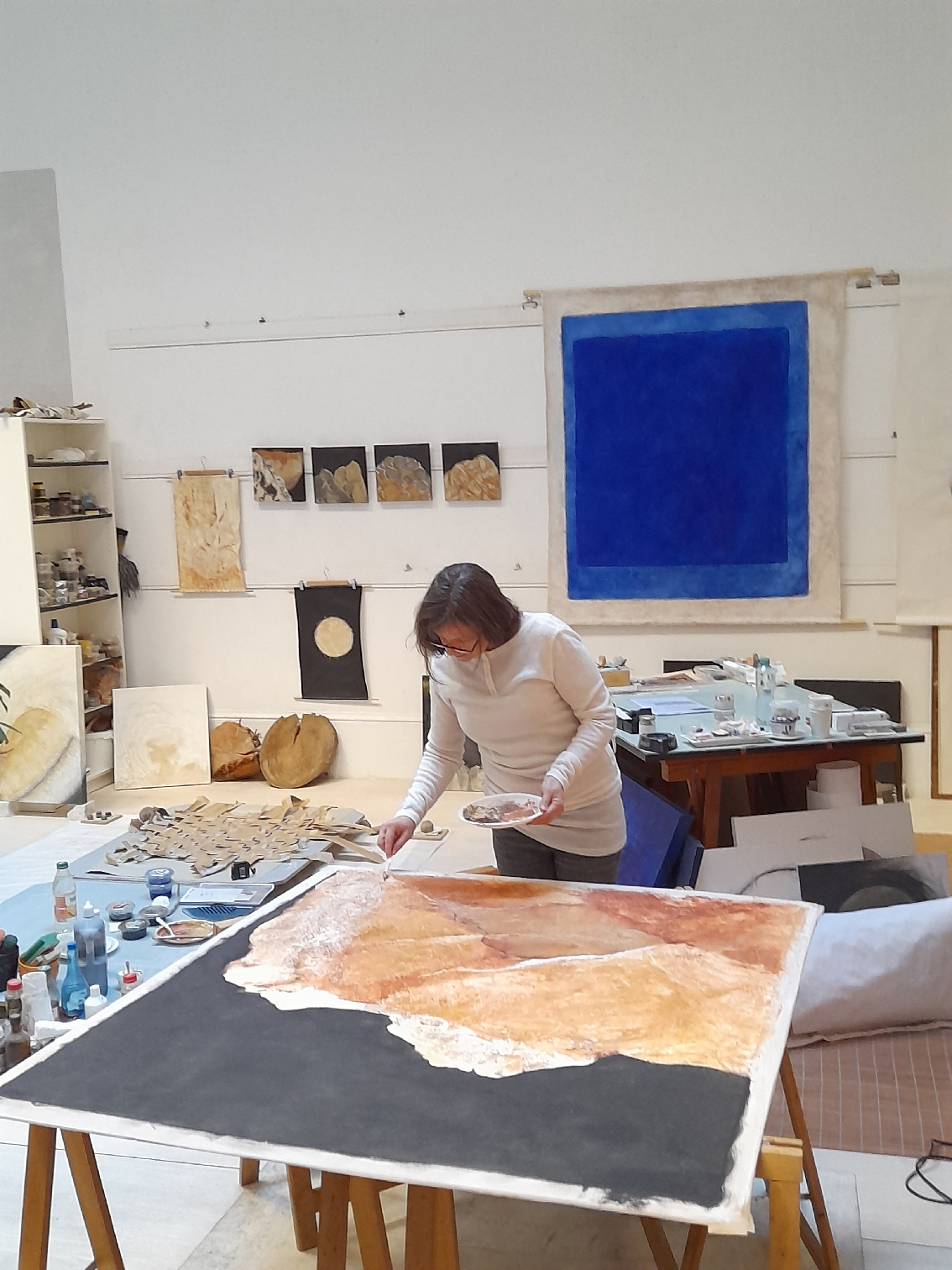 L’attention portée à la création de mes couleurs et à la préparation de mes supports apporte un aspect méditatif à mes objets peints, alors qu’elle m’ouvre un champ de réflexion de plus en plus dense sur les conditions matérielles dans lesquelles évolue mon art.